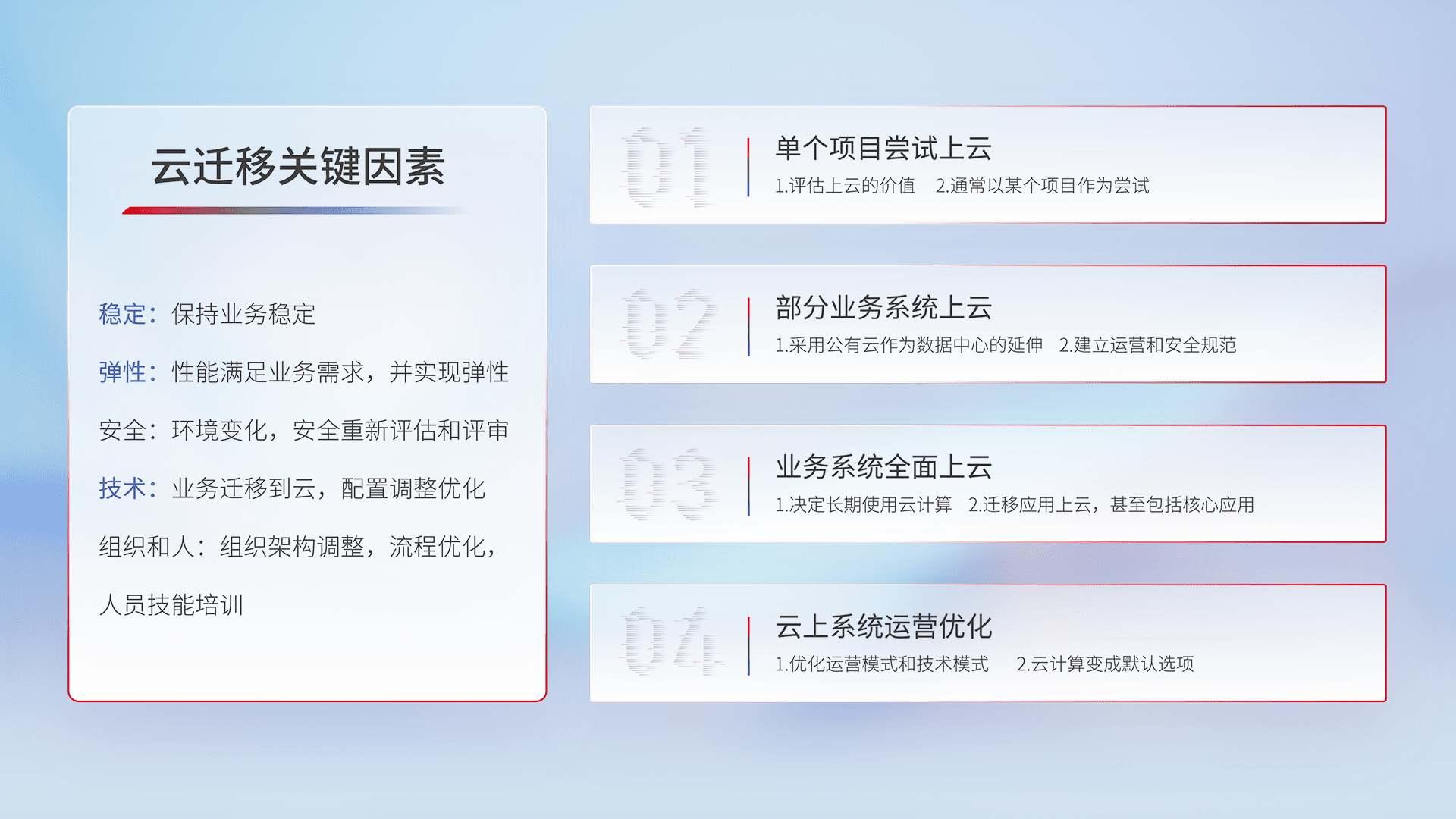 结合实际业务,,,从规划设计、、、、云平台选型、、云原生改造、、、、数据迁移、、、集成交付,,,迁移全过程为客户识别最佳上云路径,,做好风险识别管理,,,,设计网络架构、、身份权限、、安全审计合规、、、、操作审计、、日志审计、、、监控告警策略、、多站点容灾设计等,,,,对云上基础设施进行整体规划,,提升IT治理水平,,,,以满足弹性、、、、高可用、、、高性能的需求。。。。