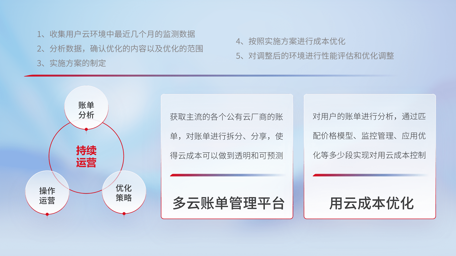 通过多云纳管,,,以统一的资源数据模型把客户的云资源进行抽象和封装,,,,进而实现对多云资源的统一操作,,,保障云资源管理的可靠性、、、稳定性与可用性。。量身定制化运维内容,,配置、、、、开发运维、、、、补丁管理、、备份、、、监控、、认证和访问管理、、审计和日常巡检等,,,,保障在用云过程中的可靠度,,稳定度以及高可用率。。。。